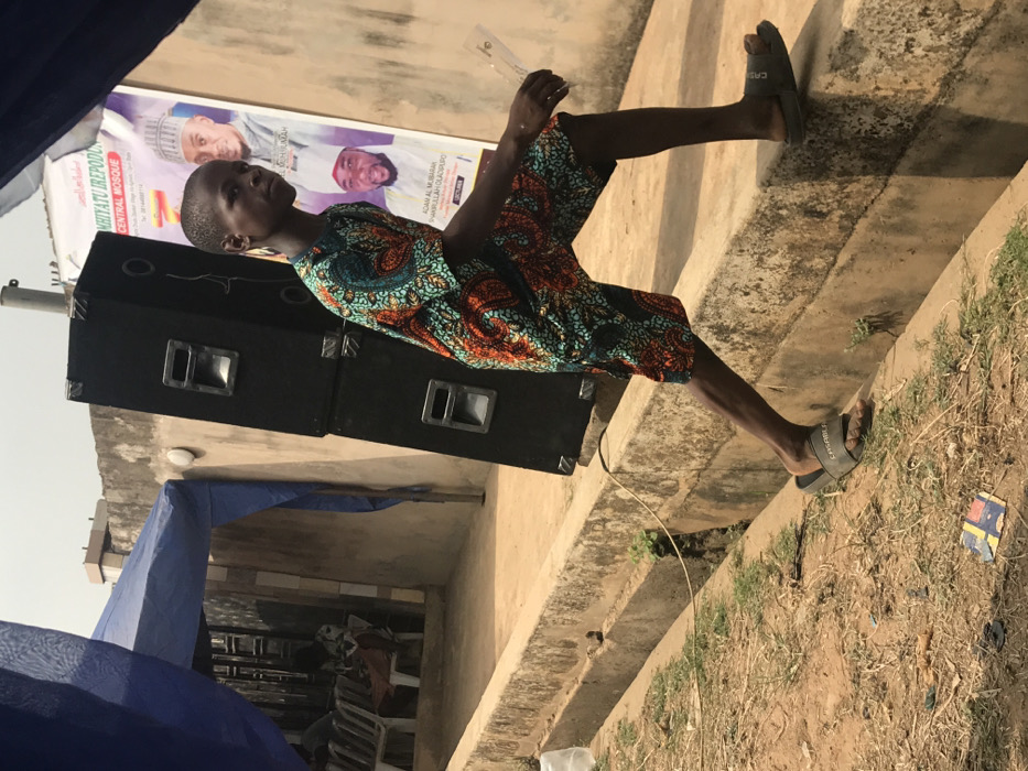 A young, dark-skinned male subject, wearing a short-sleeved, patterned shirt and matching shorts in green, orange, and blue, and dark slide sandals, is captured in motion in an outdoor environment in Orudu, Ijesha Isu Street, Agara, Ilorin, Kwara State, Nigeria, an area within or near Orudu-Olokan. The individual is actively stepping across a concrete barrier, with their left foot on the lower unpaved ground, sparsely covered with dry vegetation and miscellaneous debris, and their right foot planted on the higher concrete surface. A clear plastic item is held in the subject's right hand, pointing slightly downwards. Positioned behind and to the left of the central figure, two black, rectangular professional audio loudspeakers are stacked vertically on the higher concrete level. Each speaker features silver-colored handles. A black cable extends from the lower loudspeaker, across the concrete, and into an adjacent concrete drainage channel. To the right of the loudspeakers, a large white banner is prominently displayed, featuring text in English and possibly Arabic. Identifiable English text includes "MHIYATU IREPODUN CENTRAL MOSQUE" and its location: "Orudu, Ijesha Isu Street, Agara, Ilorin, Kwara State." The banner also features two portraits of men, with one identified as "ADAM AL MUBARAK SHAKIRULLAH OLADAPO" in relation to a "LECTURE." In the background to the left, a blue tarp canopy extends over an area containing multiple white plastic chairs, some occupied by partially visible individuals. A light-colored building wall serves as a backdrop. The overhead sky is bright and clear, indicating daylight. The arrangement of objects, including loudspeakers, a descriptive banner, and seating, indicates an organized outdoor community or religious event.