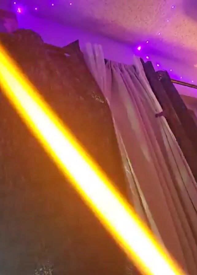 room decorated with purple string lights along the ceiling. The camera is positioned low, looking upwards towards a window covered with gray and white curtains. A blue flame appears in the foreground, emitting from a torch-like device. The flame flickers and fades before disappearing, leaving the curtains as the sole focus of the view.