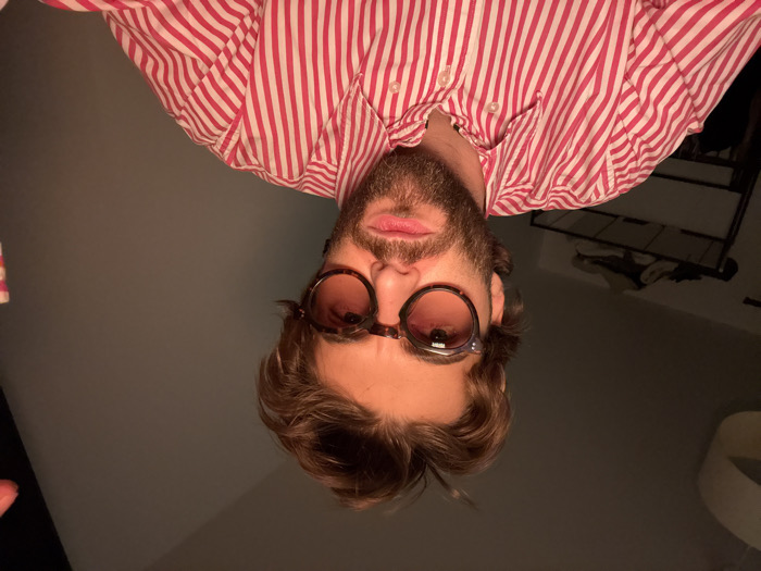 A man with a beard and sunglasses gazes downward. He wears a pink and white striped shirt. The image is upside down. A lamp and some shadowy objects are visible in the background. The lighting is dim, giving the picture a slightly muted tone. His hair is light brown.