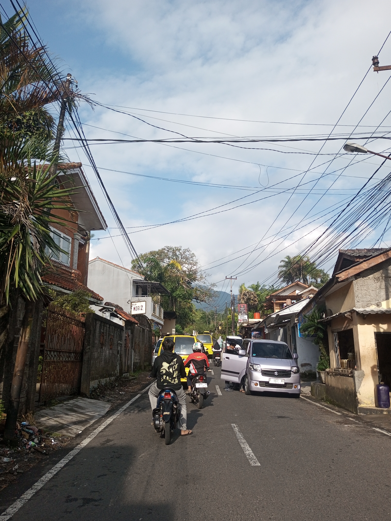 A street in Mya Sit Kaing Ywar Thit, Myanmar is congested with vehicles. A silver minivan has its driver's side door open. Two motorcyclists are traveling down the street, one behind the other. Buildings line both sides of the street with a mix of residential and commercial properties. Overhead are numerous electrical wires. The sky is blue with scattered clouds.