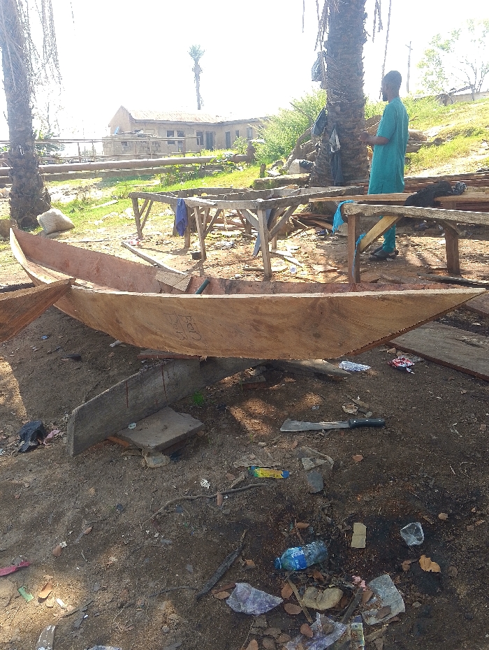 The image displays an outdoor scene in Lokoja, Nigeria, depicting a boat construction or repair area under bright daylight
