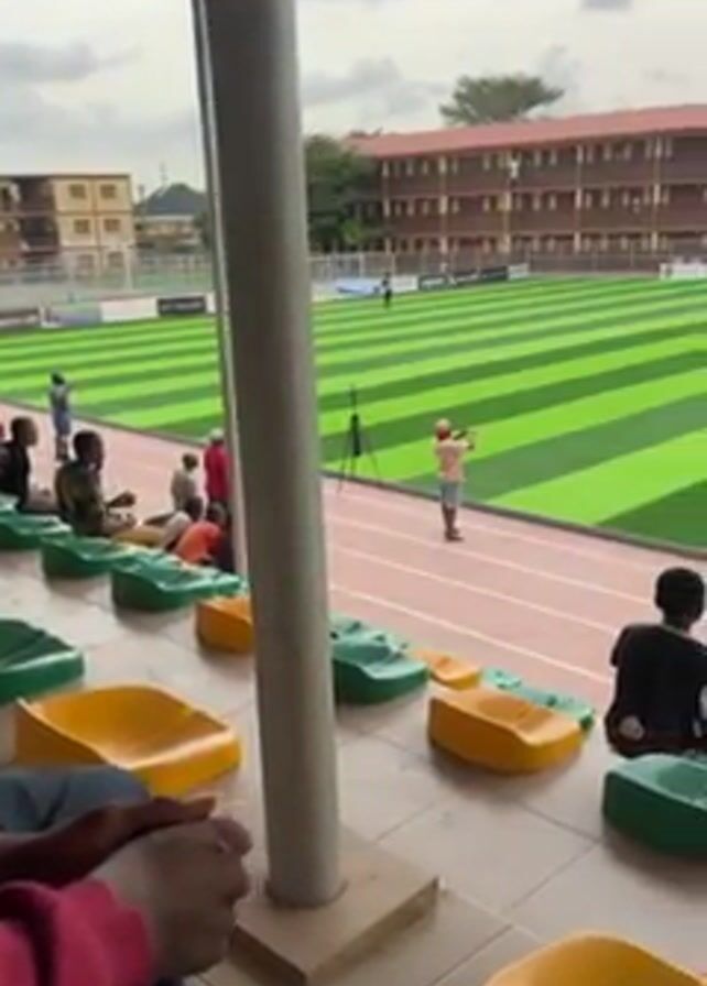 soccer game in progress on a green and white striped artificial turf field. The view is from the stands, which are mostly empty with only a few spectators. The field is surrounded by a running track. The players are wearing red and black jerseys. A person in an orange hat stands by the edge of the field. Behind the field, there is a multi-story building. The sky is overcast.