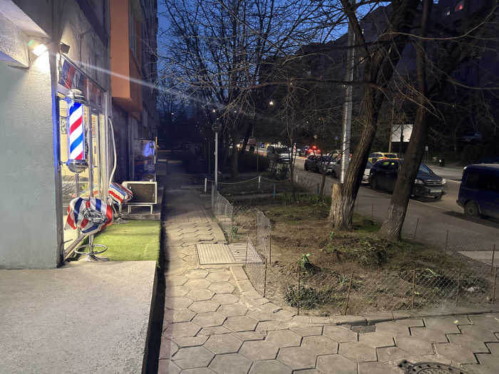 The image depicts an urban streetscape in Sofia, Bulgaria, during evening hours under low light conditions. On the left, a commercial building with light grey and orange exterior sections features a barbershop storefront. A bright, illuminated barber's pole with red, white, and blue spiraling stripes is affixed vertically to the exterior wall, along with a square wall-mounted floodlight. Immediately outside the shop, two high-backed bar stools upholstered in matching red, white, and blue stripes are positioned on a patch of artificial green turf. A paved sidewalk, constructed from grey hexagonal interlocking pavers, extends from the shop front into the midground. An unkempt narrow median strip, bordered by a low chain-link fence, contains bare deciduous trees and a visible tree stump, separating the sidewalk from the asphalt road. A circular metal manhole cover is present on the sidewalk in the bottom right quadrant. The asphalt road, visible on the right, accommodates multiple vehicles, indicated by illuminated headlights and taillights suggesting moderate traffic flow. A dark blue van is partially present in the far right lane. In the background, multi-story buildings and additional bare trees are visible under ambient street lighting. No human figures are discernible in the scene.