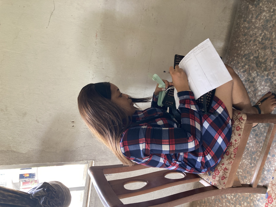 - "A female individual is seated indoors on a wooden chair with a patterned cushion, actively writing on a piece of white paper held over a black woven bag or basket" by FM-YUKtu2, licensed under CC BY 4.0