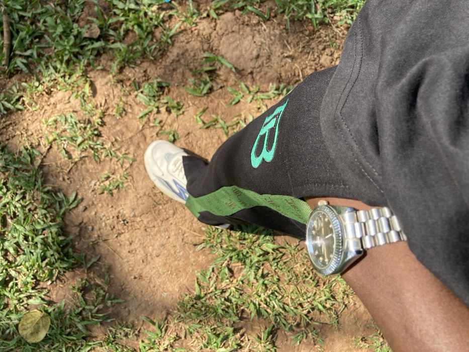 The image depicts a high-angle view of an individual's lower body and the immediate ground environment. The subject is wearing black athletic pants with a vertical green stripe running down the outside of the right leg. A stylized teal-colored logo, appearing as "JB" or "IB," is embroidered on the outer thigh area of the right leg. The right foot is adorned with a white athletic shoe featuring blue and grey accents. On the left wrist, a silver-toned wristwatch with a metal Jubilee-style bracelet and a fluted bezel is visible. The watch face appears dark. The skin of the visible arm is dark-toned. The ground consists of reddish-brown soil, interspersed with patches of green grass and a few scattered dry, brown leaves. The lighting suggests an outdoor, sunny daytime setting. The specific location within Abuja, Nigeria, cannot be precisely identified from the visual evidence, but the environment is consistent with an outdoor, unpaved natural area such as a park, a walking trail, or an undeveloped plot.