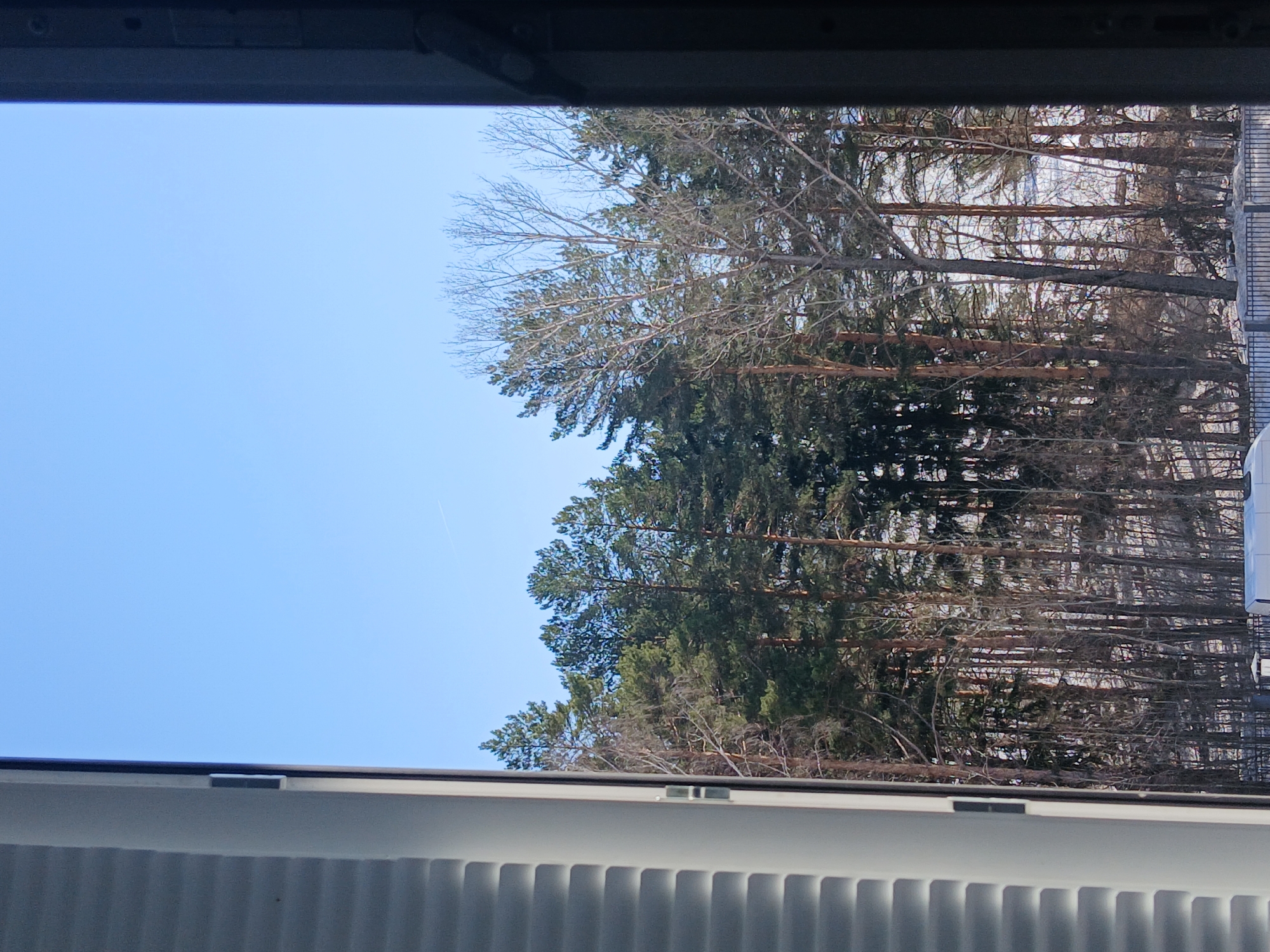 view of a pine forest through a window, taken in Chaikovsky, Russia. The sky is a clear blue. A line of trees is visible, some with green foliage and others with bare branches. The window frame is visible at the top and bottom of the image.