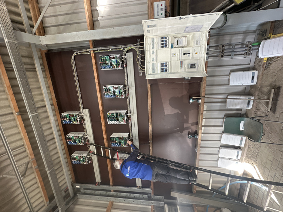 The image depicts the interior of an industrial or utility building in Lelystad, Netherlands, during an electrical installation or maintenance operation. A single male individual, wearing a blue jacket with a white "Energie" logo, dark trousers, and dark shoes, is positioned on a black metal step ladder. He is actively engaged with one of eight electrical inverters mounted on a brown wall panel. The inverters, arranged in two horizontal rows of four, have their white covers removed, exposing green circuit boards and internal wiring. To the right, a large white electrical distribution panel is mounted with its door open, revealing multiple circuit breakers, meters, and organized wiring. A QR code sticker is visible on the inner surface of the panel door. Electrical conduits and cables run systematically between the inverters, to the distribution panel, and along the wall towards the ceiling, where metal cable trays are visible. Below the mounted equipment, a wooden shelf holds two cordless drills. The floor surface consists of uneven dirt with some scattered paving stones. Objects on the floor include a green plastic chair, a broom, and several white, rectangular panels, likely inverter covers. The building's structure is characterized by corrugated metal walls and ceiling, supported by horizontal wooden beams. Shadows cast on the brown wall suggest an internal light source or natural light from an unseen opening.