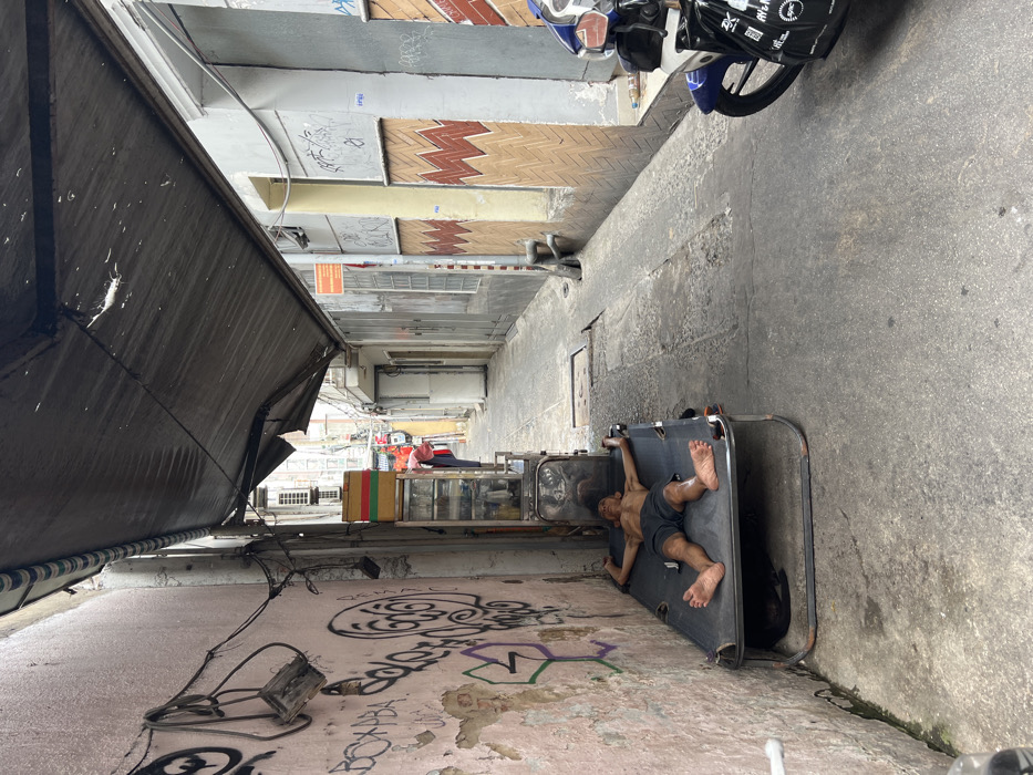 A narrow, shaded alleyway in the city of Unknown, Unknown, is depicted with concrete paving and aged buildings on either side. A male individual, shirtless and wearing dark shorts, lies supine on a dark grey portable cot positioned against the graffiti-covered, peeling light pink wall on the left. His arms are outstretched, gripping the cot frame, and a black cat rests partially visible underneath the cot. Adjacent to the cot, a metal street vendor cart displays stacked green, red, and yellow boxes on top, with internal shelves reflecting the scene. Overhead, a dark fabric awning extends across the alley. On the right, a blue and black motorcycle with a black plastic bag on its handlebar is partially visible, next to a wall featuring a brown and light-orange zigzag pattern. Further down the alley, the perspective narrows, revealing additional buildings, air conditioning units, and a distant, blurry figure dressed in red.