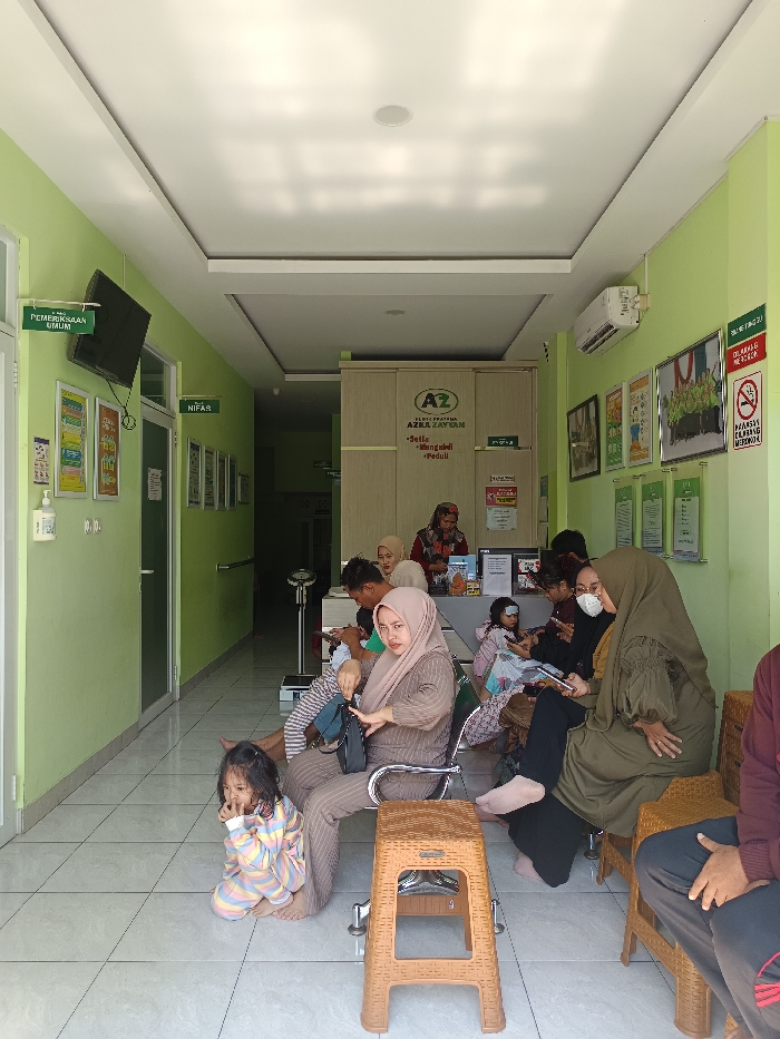 The image displays the waiting room of Klinik Pratama Azka Zayyan, a medical clinic located in Maleber, Indonesia