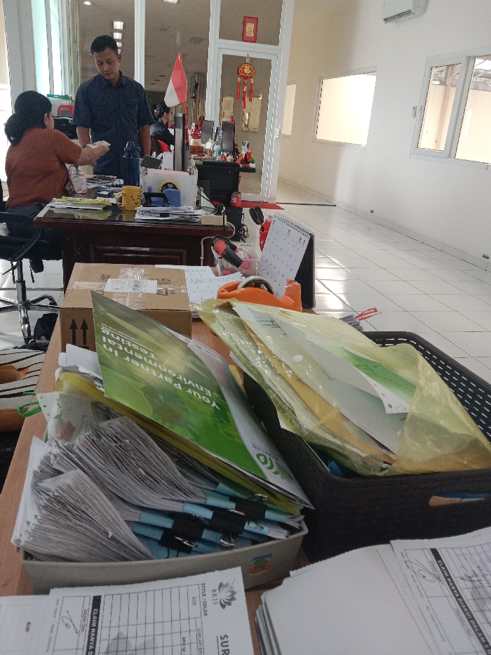 cluttered office desk with a basket overflowing with papers, files, and documents. Some of the papers have green and yellow overlays. Forms with tables and text such as "Claim Hanya" and "Style/Color Size" are visible. A man and woman are interacting near the desk in the background. A calendar, tape dispenser, and cardboard box sit atop the desk. The office has white walls, tile flooring, and windows.