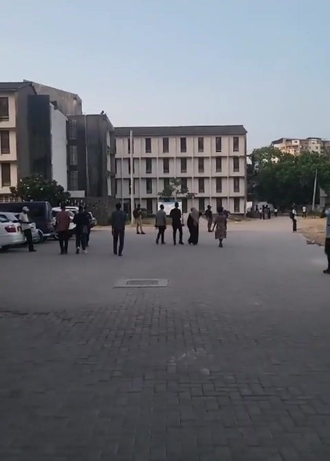 paved area in front of two buildings, with people walking across it. The buildings are modern, with a light color and numerous windows. One building is taller than the other. There are several parked cars visible near the buildings. The sky is a pale blue, suggesting it is either early morning or late afternoon. The surface of the paved area is made of grey stones laid in a pattern. People are walking in various directions, but there is no indication of interaction among them.