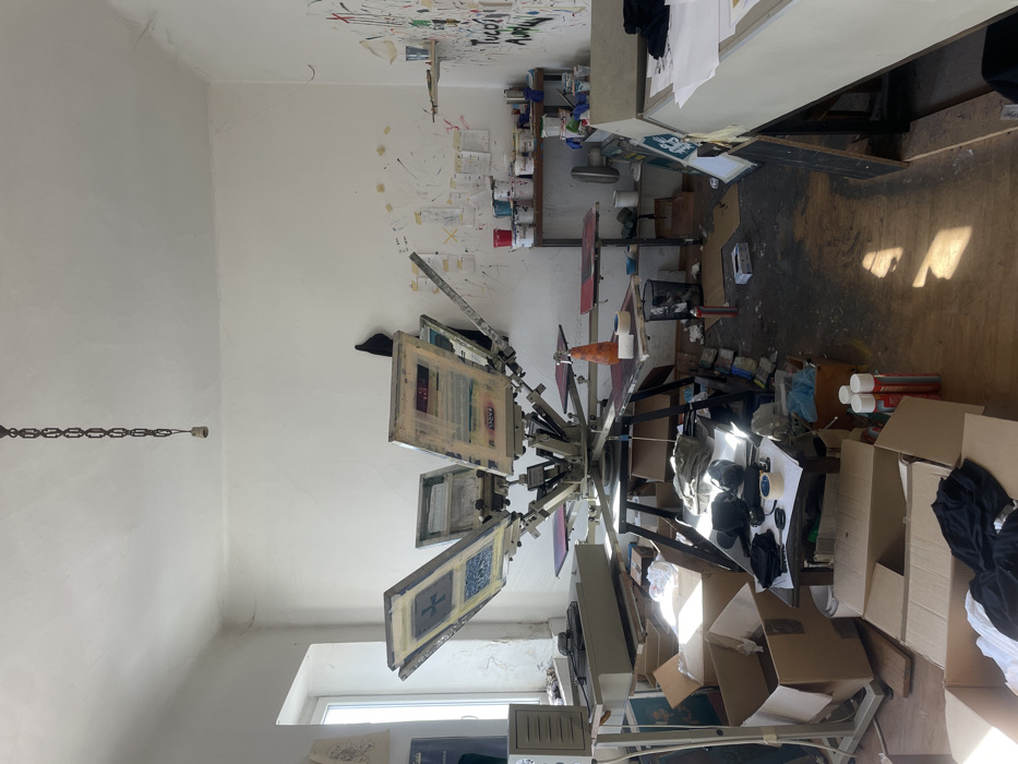 This image depicts a cluttered screen-printing workshop located in Nikšić, Montenegro