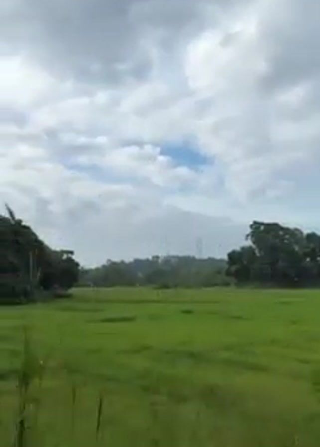 rural landscape with a large green field under a cloudy sky. There are trees and some buildings in the distance. The camera appears to be moving, likely from a passing vehicle, as evidenced by the blurred foreground foliage and utility poles.