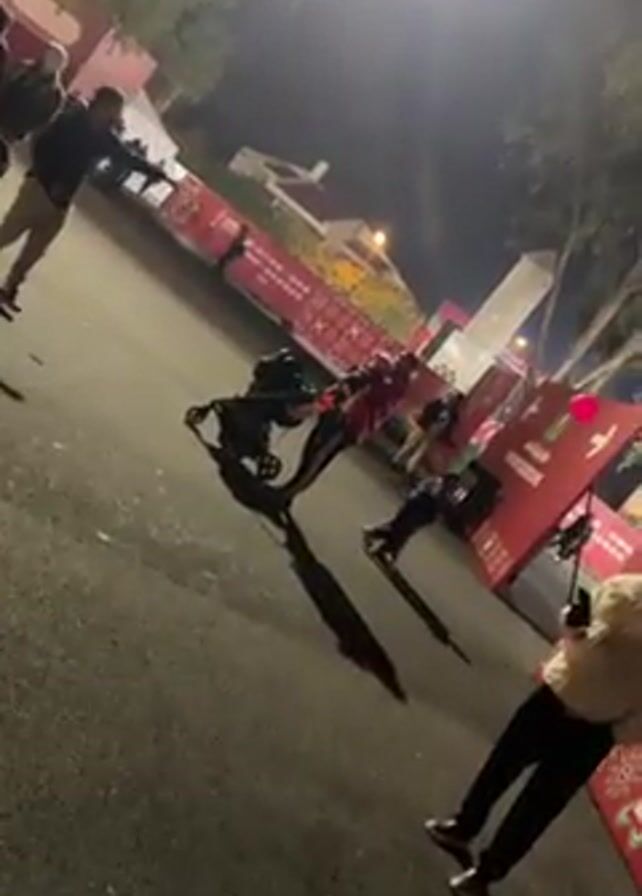 At night, in an outdoor setting, a group of people are gathered around what appears to be a festival or event space marked by red and white panels. A person in a red jacket picks up a child while another child stands nearby. A baby stroller is also present. The area is lit by overhead lights, casting long shadows. People are walking around, some holding phones, seemingly capturing the moment. The overall atmosphere suggests a festive occasion with families enjoying themselves.
