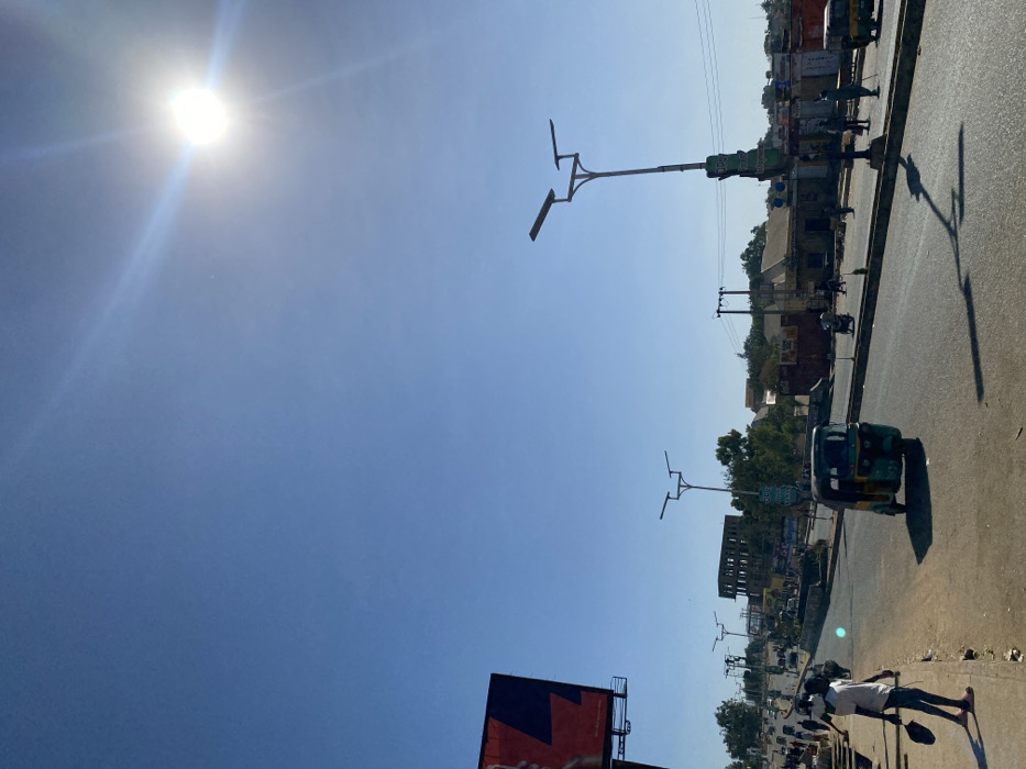 The scene depicts a sunny daytime view of a street in Kabong, Nigeria. A wide asphalt road, possibly multi-lane, occupies the central and lower portions of the frame. Strong shadows from streetlights are cast across the road surface. On the left side, a dirt and gravel sidewalk features a person in a white shirt and dark trousers, wearing pink footwear, standing with their back partially to the camera, holding an item in their left hand. Behind them and to the left, a large billboard with red and black graphics, including a prominent lightning bolt design, is visible. In the middle of the road, a green and yellow tricycle (keke Napep) is positioned, facing away from the camera. Further down the road on the left, additional people and vehicles are visible in the distance. The right side of the road is lined with several streetlights, each featuring a double solar panel array. The closest streetlight has a green, possibly decorative, base with white lettering. Beyond the streetlights, various buildings line the street, ranging from single-story structures to a multi-story, unfinished concrete building in the mid-ground. Power lines run along this side of the road. Several individuals are present on the right sidewalk, and another tricycle is visible further down. The sky is clear and bright blue, with the sun prominently visible in the upper right corner, causing a lens flare effect. Sparse trees and vegetation are scattered among the buildings in the urban environment, which extends into the background.