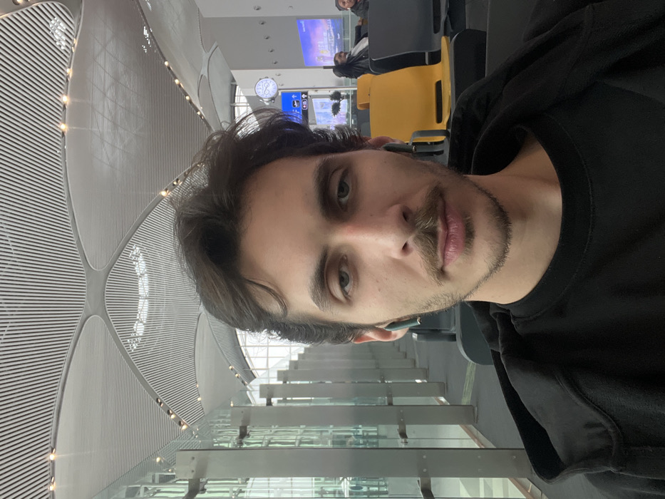 - "An adult male is depicted in a close-up, chest-up self-portrait taken within a modern airport terminal" by FM-T5Wdg1, licensed under CC BY 4.0