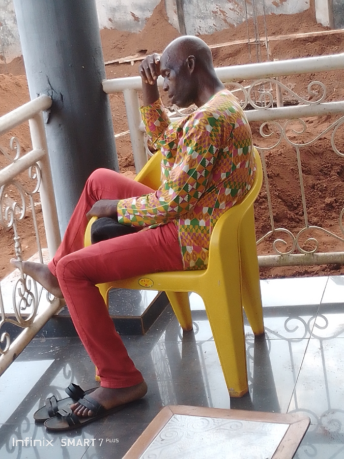 A bald, dark-skinned male is seated in profile, facing right, on a yellow plastic chair. He is wearing a long-sleeved shirt with a multi-colored geometric pattern and red trousers. His bare feet rest on the tiled floor, with a pair of dark sandals positioned below his right foot. His hands are clasped over his forehead, and his head is bowed forward. He is situated on what appears to be a tiled patio or balcony, adjacent to a gray concrete pillar and a white metal railing with decorative scrollwork. In the foreground, on the tiled floor, a square object resembling a mirrored tray or tile with an etched pattern is visible. The background reveals an outdoor area characterized by exposed red-brown soil or dirt mounds, possibly indicating a construction site or undeveloped land, with some visible concrete structures and rebar. This scene is located in the city of Akokwa, Nigeria.