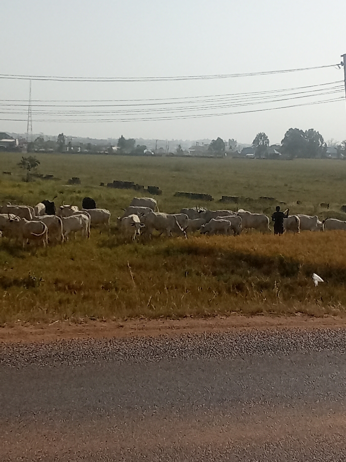 The scene depicts a pastoral landscape near an urban fringe in Nabatum, Nigeria, under a hazy, pale sky