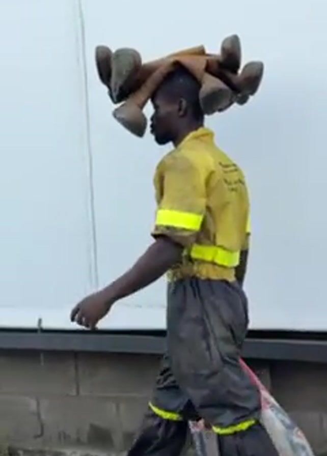 A man in a yellow uniform with reflective stripes and dark gray waterproof pants walks to the right, carrying a load of shoes on his head
