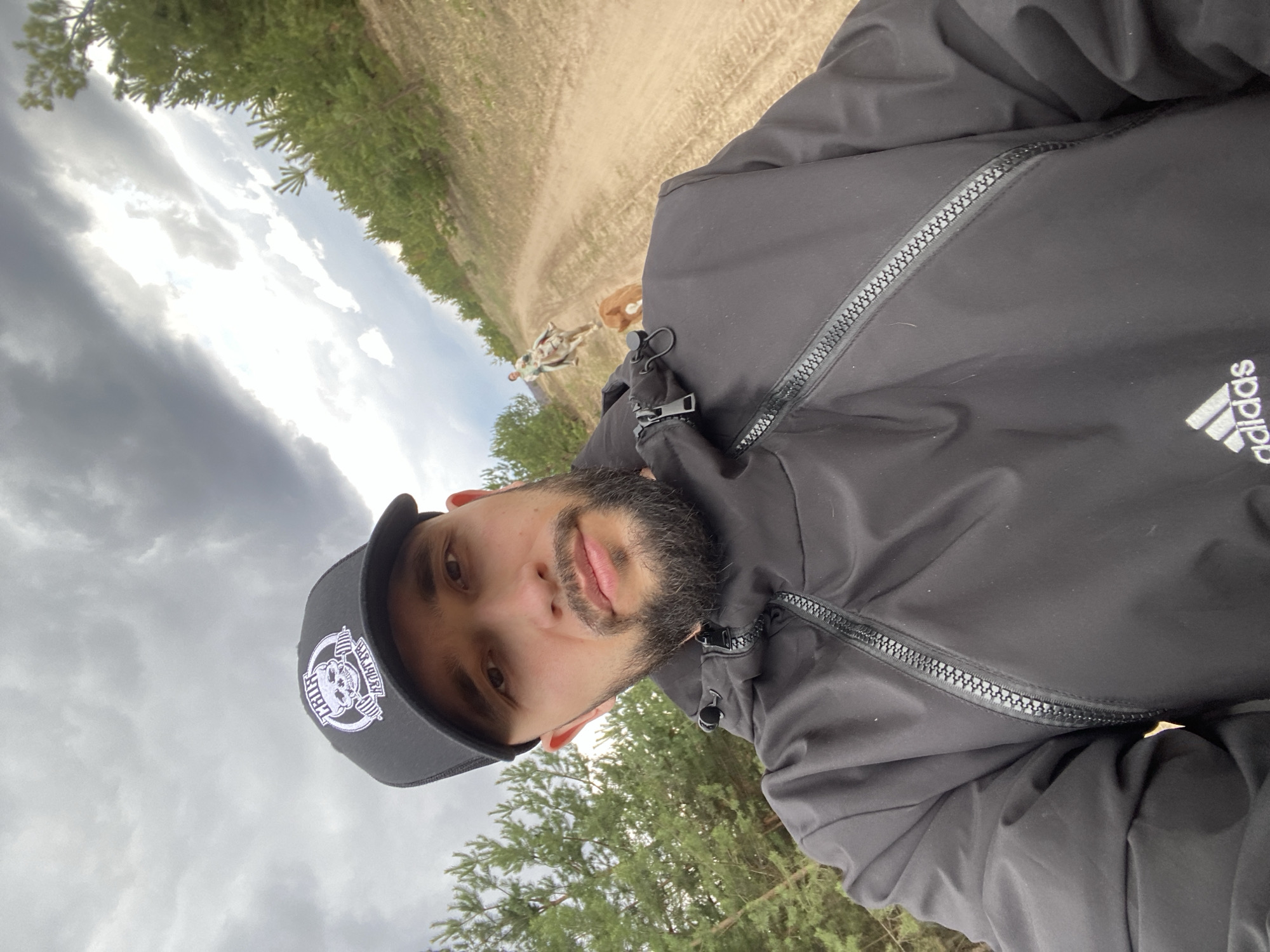 A selfie taken outdoors shows a man in a black Adidas jacket and a black baseball cap with a skull logo