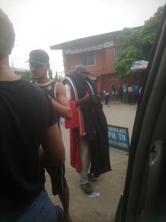 Three people stand on a street. One wears a black hat and basketball jersey. Another man, in the center, carries many colorful robes. He wears grey pants and sandals. Behind them, other people gather near a building labeled "RIVERS JOY." A sign reading "RIVERS JOY PH. TO AUCHI-UROMI" is also visible. The photo is taken from inside a vehicle, with part of the car door frame visible on the right side.