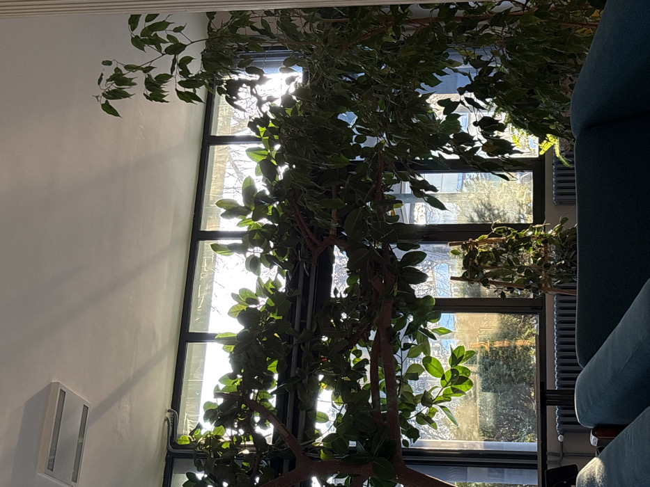 The image depicts an indoor scene within a building in Kragujevac, Serbia, characterized by natural light and extensive plant life. The upper portion features a white ceiling with a single rectangular recessed light fixture positioned towards the upper left quadrant. Multiple parallel shadows are cast across the ceiling, suggesting strong sunlight originating from an external source interacting with an unseen structure or window frame. The mid-section is dominated by a wide expanse of dark-framed windows, divided into multiple panes. Through these windows, a bright outdoor environment is visible, including bare tree branches and hints of distant architectural structures. Below the windows, a dark, horizontal panel radiator is installed. Prominently featured are multiple large, green houseplants. A significant plant with a robust, multi-branched brown stem and broad, oval-shaped green leaves occupies the left and central mid-ground, extending upwards across the window line. To its right, another tall plant with denser, finer green foliage partially obscures the rightmost window sections. A smaller climbing plant with light and dark green leaves is supported by a light brown wooden trellis, positioned centrally in front of the lower window section. The plants' leaves are strongly backlit by the sunlight, creating bright highlights and deep shadows. The lower foreground shows the upper sections of teal-colored upholstered furniture, likely a sofa or armchairs, with a portion of the left side illuminated by sunlight. No people are visible, and no specific actions or interactions are occurring. The environment appears calm and well-maintained.