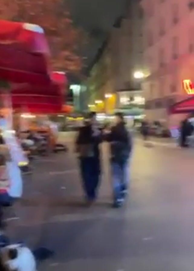 n outdoor scene at night, likely in a city. People are sitting at tables under red canopies in front of a restaurant or cafe. There are plants in large red pots nearby. A black and white cat is visible near the edge of the seating area. Across the street is a building with a lit-up display and a red sign, possibly a business establishment. Cars and scooters are parked along the street, and people are walking on the sidewalk. The overall atmosphere suggests a lively evening scene.