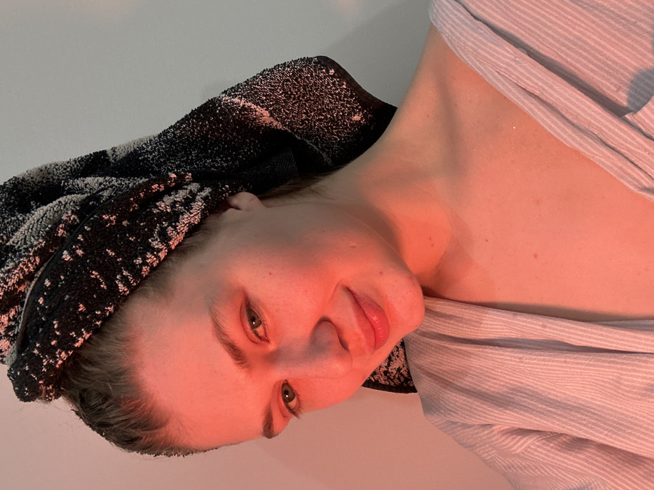A female subject is depicted in a close-up, chest-up portrait, located in Matyushino, Russia. Her head is wrapped in a dark-colored, patterned terrycloth towel, secured in a turban-style. Light brown hair is pulled back beneath the towel. She is wearing a light-colored, vertically striped garment, consistent with a robe or shirt, partially open at the upper chest. The subject possesses a fair complexion, exhibits a slight smile, and maintains direct eye contact with the viewer. The scene is illuminated by an artificial red light source, casting a strong crimson hue across her face, neck, and exposed upper chest. Subtle light-colored speckles or shimmer are visible on her clavicle area. The background consists of a plain, light-colored wall. No additional individuals or distinct objects are present in the visible environment.
