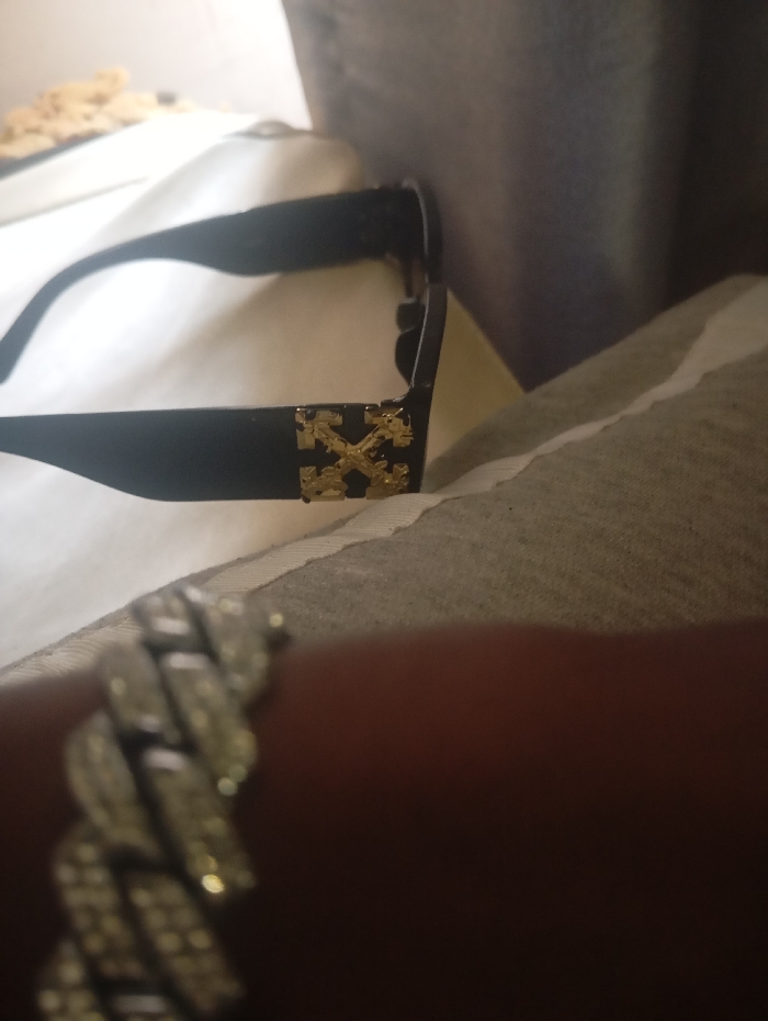 Black sunglasses with a gold "X" logo on the side rest on a patterned surface. A chunky, silver-colored bracelet is visible in the foreground, likely on a wrist. The background shows a mix of white and grey tones, possibly fabric or a cushion. There appears to be a plate of light-colored items blurred in the upper left corner. The sunglasses are the primary focus of the image.