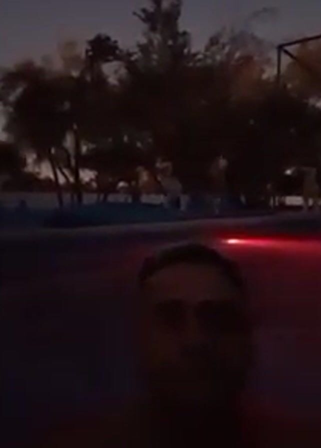 A man takes a selfie video while standing in a swimming pool at dusk. The pool is lit with a red light. The surrounding area includes trees, a basketball hoop, lounge chairs, and a camper trailer. The sky is visible in the background, suggesting it is either late evening or early morning. The man is looking at the camera with a neutral expression. The video appears to be stable.