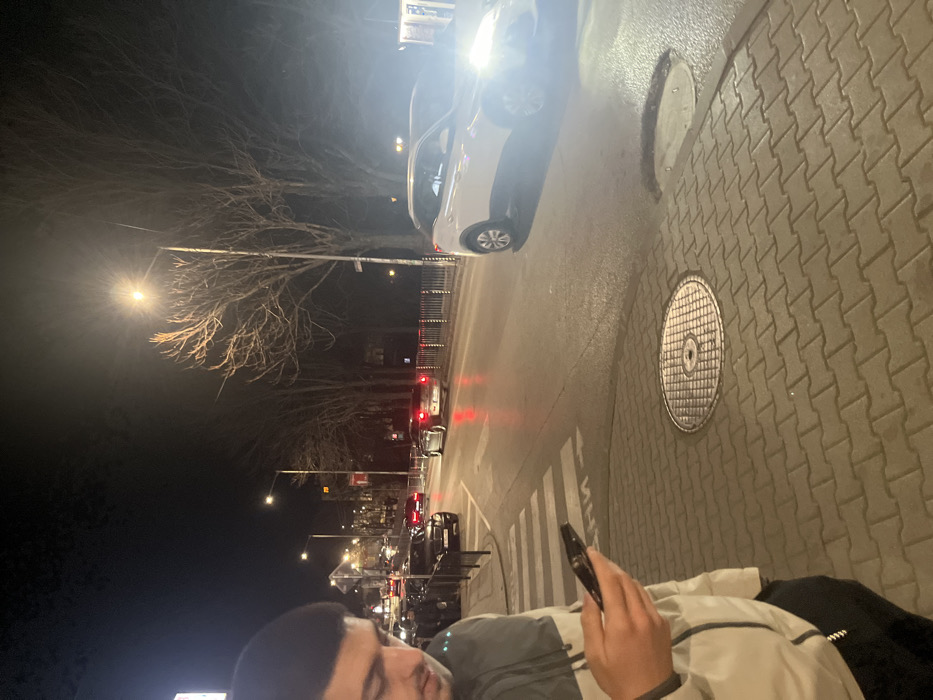 A nighttime street scene is captured on УЛИЦА АНТИМ I in Petrich, Bulgaria. In the left foreground, the upper torso and head of a male individual are visible. He is looking down at a dark-colored smartphone held in both hands. The individual wears a light-colored jacket with darker sleeves. The ground beneath him is a sidewalk constructed of light grey interlocking paver bricks, featuring two circular metal manhole covers. Directly in front of the sidewalk is an asphalt road with a white pedestrian crossing marked "УЛИЦА ААНТИМ I". On the road, vehicle traffic is observed. A white SUV, possibly a Peugeot 3008, is positioned in the right mid-ground with its bright headlights illuminated and facing the camera. Further down the street, a silver or light-colored sedan, potentially a Chrysler 300, is moving away, displaying illuminated red taillights. Multiple streetlights cast light across the scene, and bare deciduous trees line the roadside, separating it from distant background elements. A dark metal barrier runs along the edge of the sidewalk, separating it from the street. The sky is dark, indicating a nighttime setting.