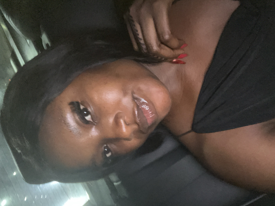 A dark-skinned woman reclines, her face turned towards the camera with a slight smile. Her glossy lips are parted, revealing a hint of her teeth. She wears dark hair that frames her face. Her manicured nails are painted red. Henna-like designs adorn her hand. She is dressed in a dark top with thin straps. The lighting is dim, lending a soft focus to the scene.
