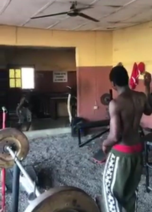 Two shirtless men are working out in a gym with old equipment. One man with green sweatpants is in the foreground doing stretches and the other is doing shadowboxing in front of the mirror. The gym looks old and is very basic. There is a bench, a barbell on a stand, and a weight-stack machine in the background. There is also a sign that says “YOUR GYM TICKET IS HERE” in the background. There is a ceiling fan on.