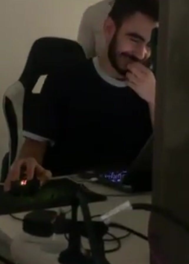 A man with a beard and short hair, wearing a dark blue shirt with a light blue collar, is sitting in a black and white gaming chair at a desk. He is smiling and covering his mouth with his hand. He is looking at a computer screen and using a gaming mouse. There is a keyboard and other electronic devices on the desk, along with a white power strip. Another person is standing behind him, partially visible. The room is dimly lit.