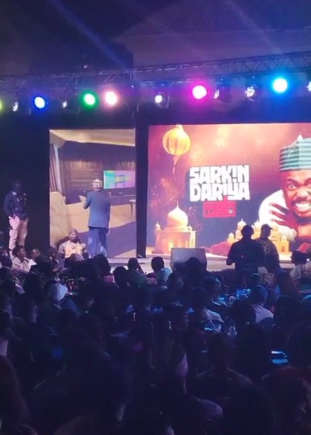 A wide shot shows a crowd of people seated in a dark indoor space, illuminated by stage lighting. A man is onstage, speaking into a microphone. There are two large screens behind him, one showing a video of a man in a suit, and the other displaying a title card that says “Sarkin Dariya True Live”. There is a security guard standing on the left side of the stage. The crowd appears to be an audience at a live event.