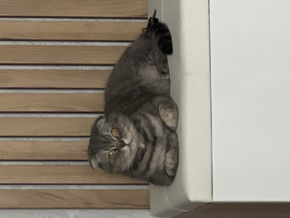 - "A gray tabby Scottish Fold cat is positioned vertically, with its head near the bottom left corner" by FM-A5lOj2, licensed under CC BY 4.0