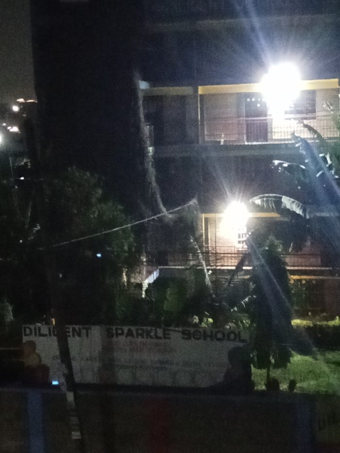 At night, "Diligent Sparkle School" is visible in a low, horizontal shot. The school's sign is faded and partially obscured. Behind the sign, foliage and trees fill the foreground, contrasting with a lit-up building in the background. The building has two floors, illuminated by bright lights shining through windows. A tall, dark tree stands to the left of the building, creating a silhouette against the night sky. Overall, the scene is dark and somewhat blurry.