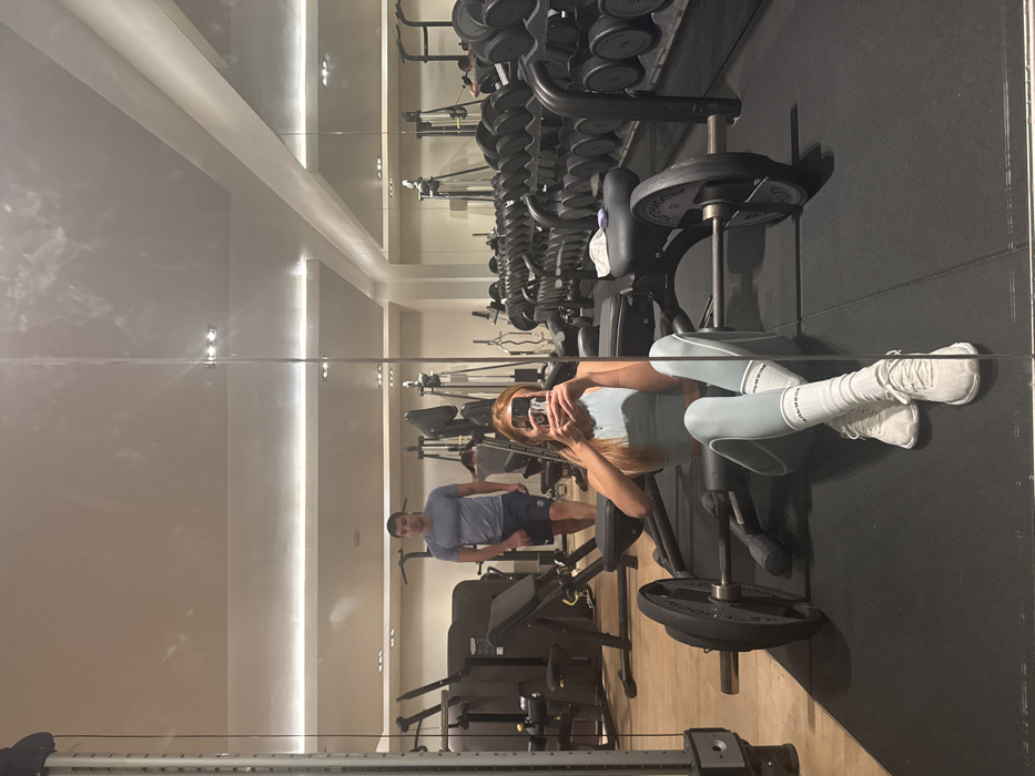 The image captures the interior of a gym in Paris, France, primarily as a reflection in a large mirror