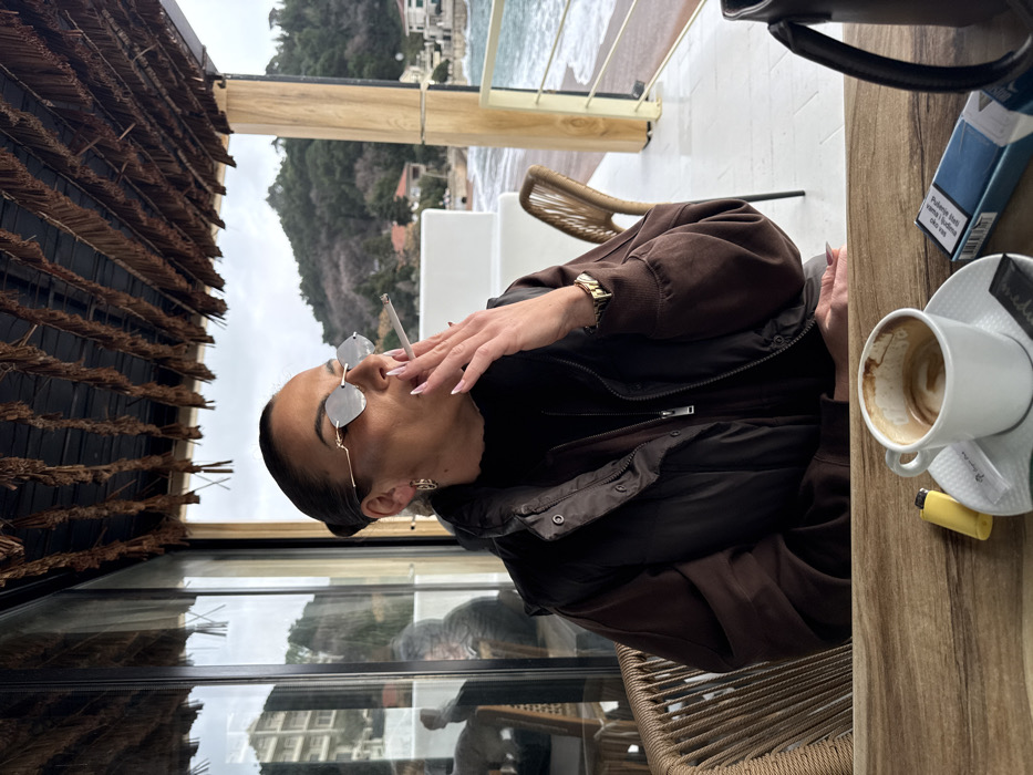 A female individual, appearing to be in her 20s or 30s, is seated at a wooden table in an outdoor covered cafe area in Petrovac na Moru, Montenegro. She is wearing dark sunglasses, a black high-neck top, a dark brown zippered vest, and a dark brown long-sleeved shirt. Gold-toned hoop earrings are visible on her left ear, and a gold-toned wristwatch is on her left wrist. She holds a lit cigarette between the fingers of her right hand, positioned near her mouth, with smoke visible. On the table in the foreground, from left to right, are a yellow disposable lighter, a white ceramic cup containing residual coffee on a saucer with two sugar packets, and a blue and white cigarette pack. A portion of a black mug is visible on the far right. The background reveals a coastal environment. To the right, the sea with active waves is visible beyond a white railing, alongside a pebbled shore and scattered buildings ascending a green, tree-covered hill under an overcast sky. To the left, a large glass window reflects exterior elements including a building, and an interior view showing a blurred figure and seating. The cafe's ceiling is constructed from a thatched or woven material. The woman is seated in a light brown, woven-style chair, with a similar unoccupied chair visible in the background.