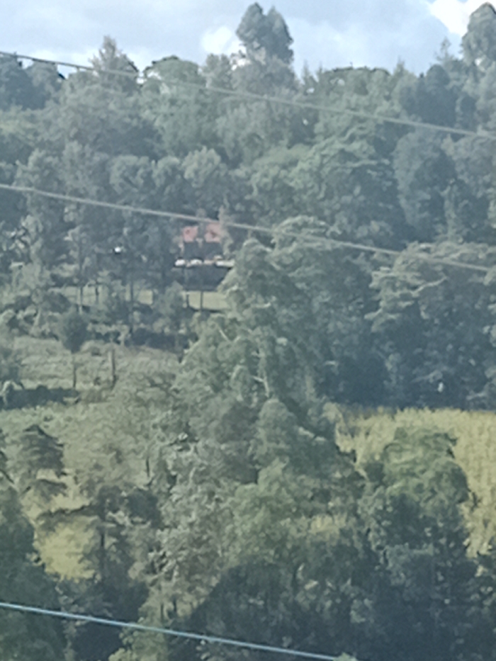view from a distance of a dense forest area. The forest is located in the city of Tenwek, Kenya, at the coordinates -0.742 latitude and 35.358 longitude. The foliage is primarily green, with some areas appearing lighter in color. There are several power lines running diagonally through the image, but no people, animals, or vehicles are visible. A small red-roofed structure is located in the center of the image, partially obscured by trees. The scene is characterized by a vast expanse of green foliage, a clear sky, and a sense of serenity.