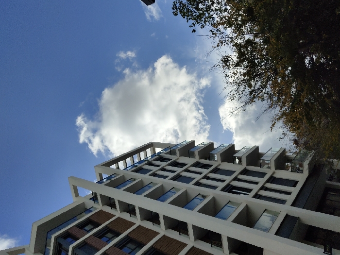 - "The image displays a modern multi-story residential building, viewed from a low angle, set against a bright blue sky with scattered cumulus clouds" by FM-3Ip2o1, licensed under CC BY 4.0