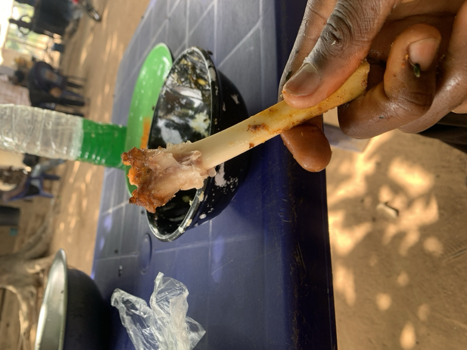 A close-up image depicts a dark-skinned hand holding a partially consumed, yellowish-white bone, likely from a chicken drumstick, with residual crispy meat and spice residue on the fingers. The hand is positioned over a blue plastic table with a textured surface. On the table, a black bowl with white speckles contains dark liquid and food remnants. A crumpled clear plastic bag is also present. In the mid-ground on the table, a clear plastic water bottle with green liquid at its base stands next to a bright green plastic plate. The background reveals an outdoor setting with dry, reddish-brown earth illuminated by dappled sunlight and shadows from overhead trees. Several blurred figures are visible, seated on blue plastic chairs around other tables, suggesting a communal dining area. The scene is located in Assai Sabongida, Nigeria.