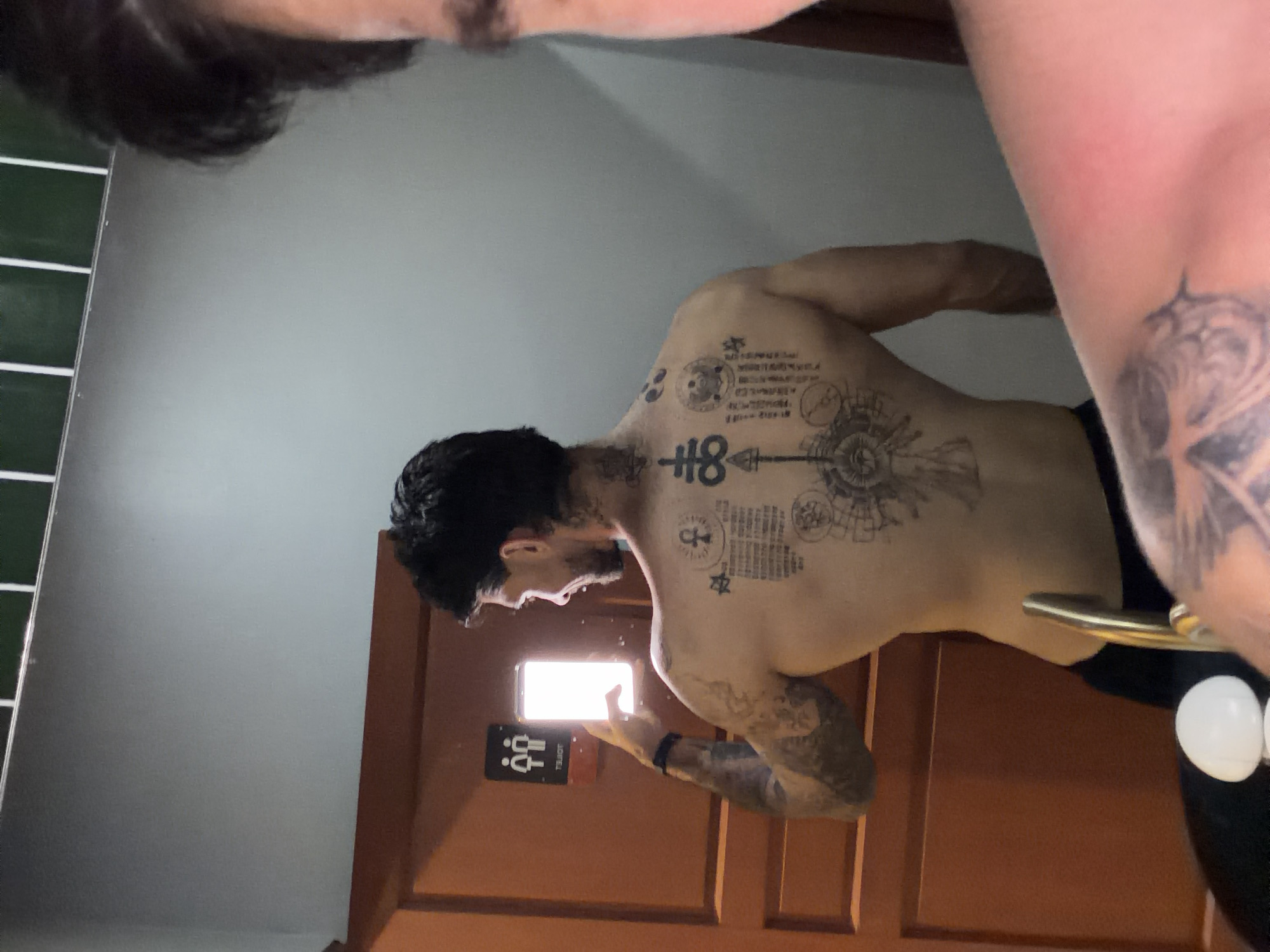 A male subject is depicted in a mirrored self-portrait within a restroom located in Kathu, Thailand. The individual stands shirtless, displaying extensive black ink tattoos across his back, arms, and neck. Notable tattoos on his back include a central, vertically oriented symbol resembling a Leviathan Cross, a complex circular design at the lower back, and multiple blocks of script or text. He holds a brightly illuminated smartphone in his right hand, positioned to capture the reflection. The mirror image reveals a brown wooden door behind the subject, featuring a reversed black and white 'TOILET' sign with male and female pictograms. To the subject's right, a light grey wall is visible. The upper background shows a section with green rectangular tiles. In the immediate foreground, a blurred metallic faucet and a white, rounded fixture are partially visible, alongside a segment of the photographer's head and tattooed arm.