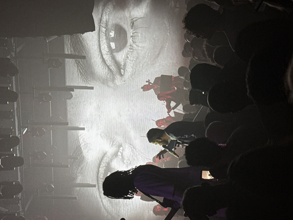 A concert setting with performers amidst a crowd. An enormous projected eye image looms behind. Stage lights and the silhouettes of musicians with instruments are visible. The crowd's heads are dark against the illuminated backdrop, some people hold up their phones. The image is dark and slightly blurred, suggesting a low-light, high-energy atmosphere.