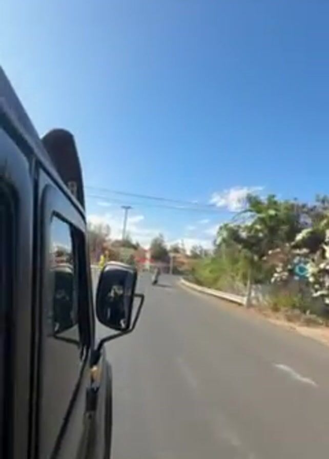 view from inside a dark-colored vehicle, possibly a jeep, as it drives on a paved road. The camera is positioned to capture the side of the vehicle, including the side mirror and snorkel. The sky is bright blue with a few scattered clouds. The road is lined with vegetation, including bushes with white flowers. Other vehicles, including a scooter and a white car, can be seen moving on the road ahead. The overall environment suggests a sunny day in a semi-urban or rural setting.