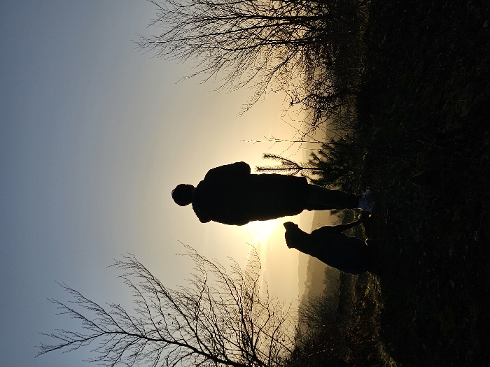 A silhouette of a person and a dog are set against a bright, setting sun. The sun's glow radiates outwards, silhouetting the pair in a darkened landscape. Leafless trees are visible in the foreground and background, adding to the stark contrast. The scene is bathed in warm, golden light, emphasizing the shapes and textures. The overall composition evokes a sense of quiet and solitude.