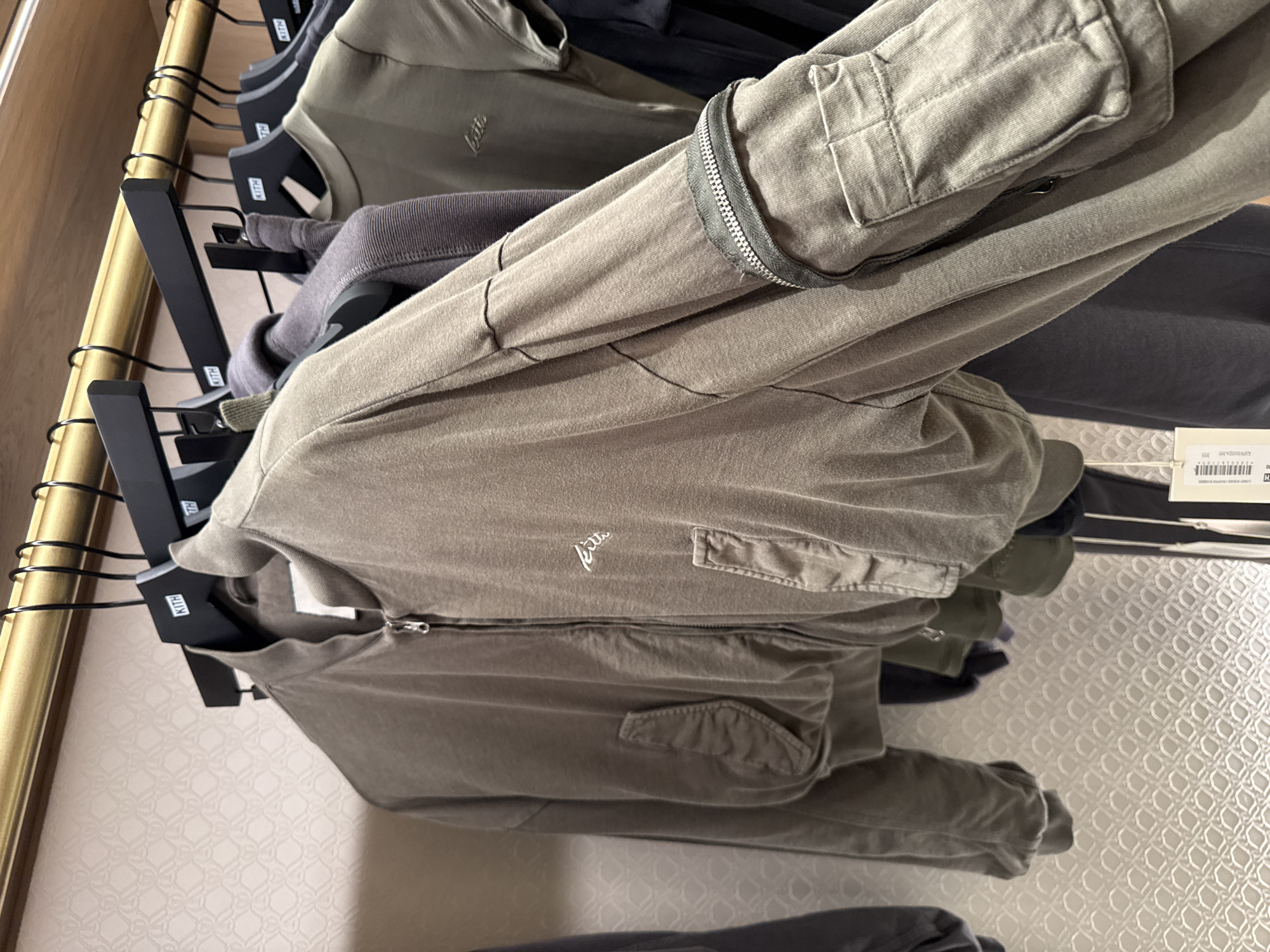 This image depicts a display of Kith brand clothing inside the Kith London flagship store, located at 34 Great Marlborough Street, Carnaby, London W1F 7JD, United Kingdom. The central subject is a faded olive-green or khaki bomber-style jacket, constructed from a soft, possibly jersey fabric, hanging on a black hanger labeled "KITH". The jacket features a prominent silver-toned zipper closure down the front, two large patch pockets on the lower front, and a utility pocket with a visible silver zipper and pull tab on the upper left sleeve. The word "kith" is embroidered in white cursive script on the left chest. To the right, additional garments including a dark grey hooded item and an olive-green short-sleeved t-shirt, both also Kith branded, are visible on similar black hangers. All garments are suspended from a horizontal golden-colored metal clothing rail. The background wall is light-colored, possibly beige, and features a repeating embossed geometric pattern of interlocking shapes. No individuals are present in the scene.