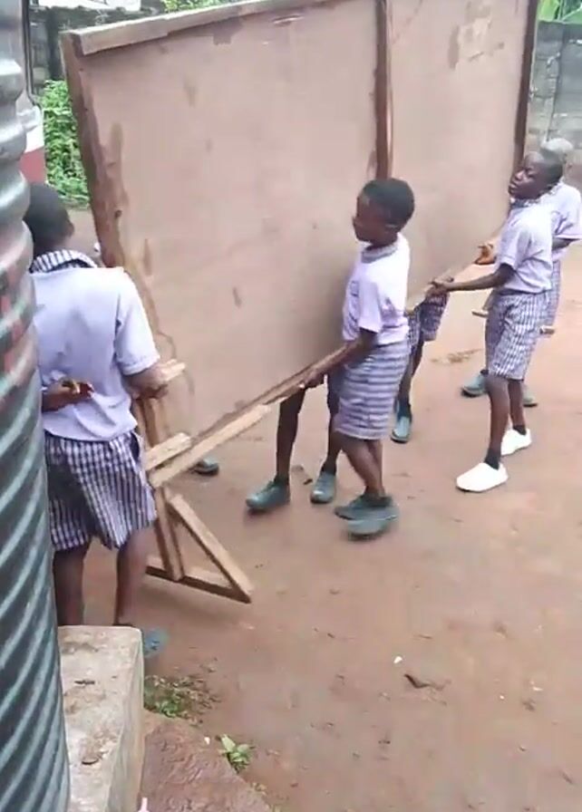 A group of about six young boys wearing purple and grey school uniforms are carrying a large, brown wooden panel. The panel is supported by a wooden A-frame structure. The boys are struggling to move the panel, and one of them briefly runs out of the frame. They are in an outdoor area with a water tank, a faucet, and some greenery. The ground is dirt.
