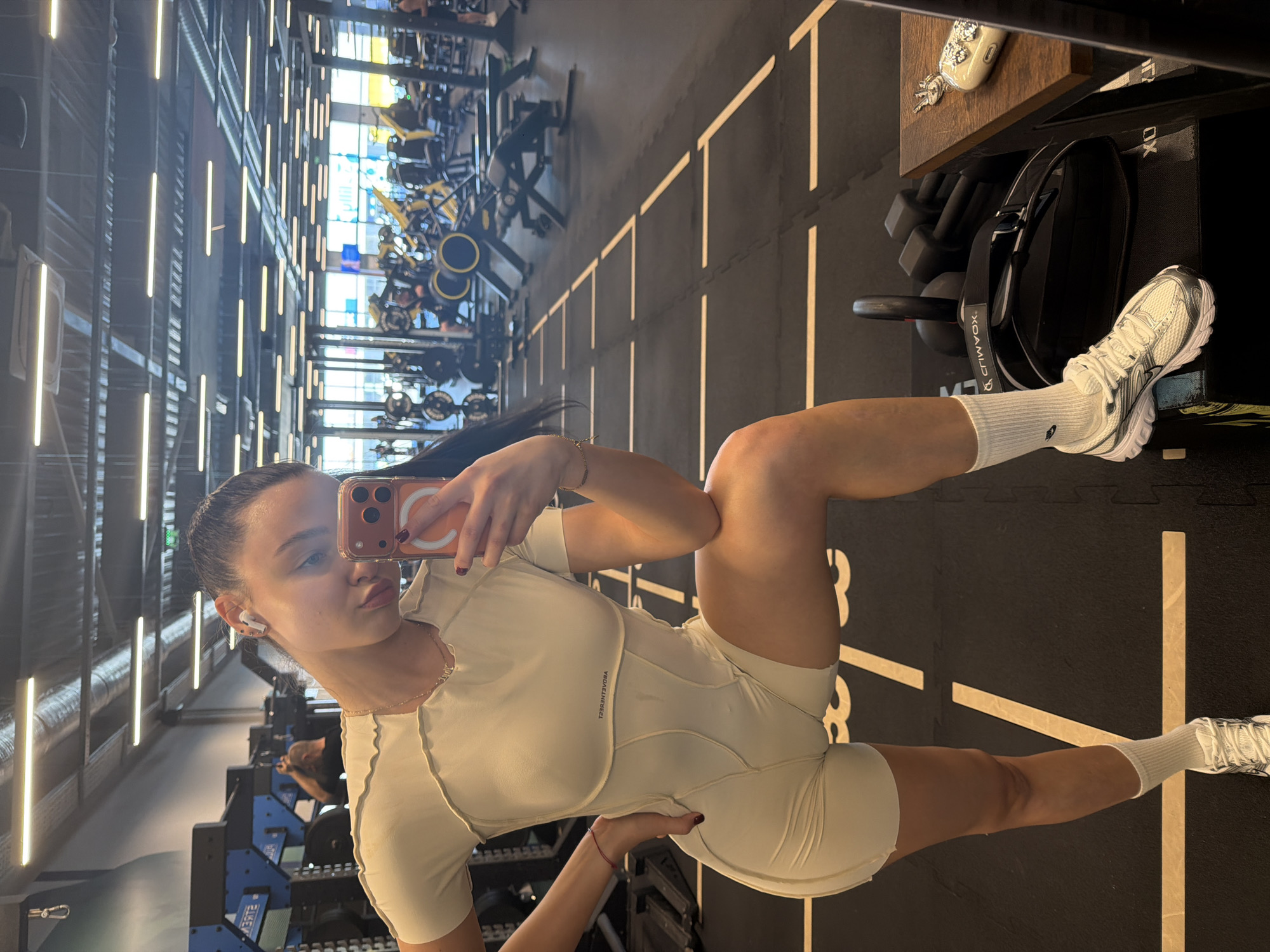 A young woman is taking a selfie in what appears to be a gym. She is wearing a light-colored athletic outfit consisting of a short-sleeved top and shorts, paired with white athletic shoes and white socks. She is holding a smartphone with a distinctive orange and white case, presumably to capture the image. The gym setting includes various exercise machines and equipment visible in the background, arranged in rows. The flooring has a black surface with a linear, patterned design. The lighting is bright, possibly from overhead fluorescent or LED fixtures. In the periphery, gymgoers can be seen using the equipment, suggesting an active environment. Specific details to indicate that the photo was taken in the city of Pernik, Bulgaria are not present.
