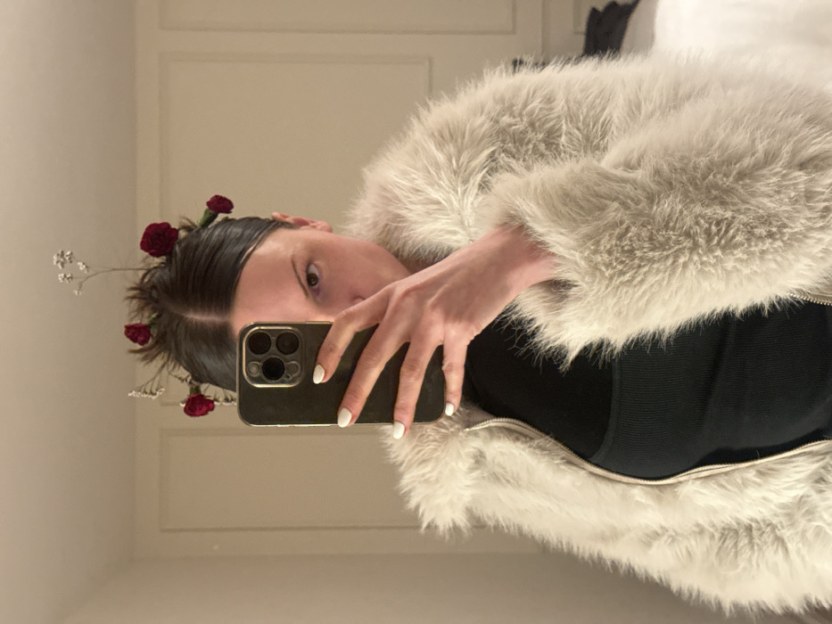 A woman poses in a mirror selfie, holding her smartphone to capture the moment. She wears a fuzzy, light-colored jacket over a black top. Her hair is styled with small red roses and sprigs of white flowers, adding a whimsical touch. The background shows a plain white wall with subtle molding. Her nails are painted a clean, white color. The image has a casual, yet slightly fashionable aesthetic.